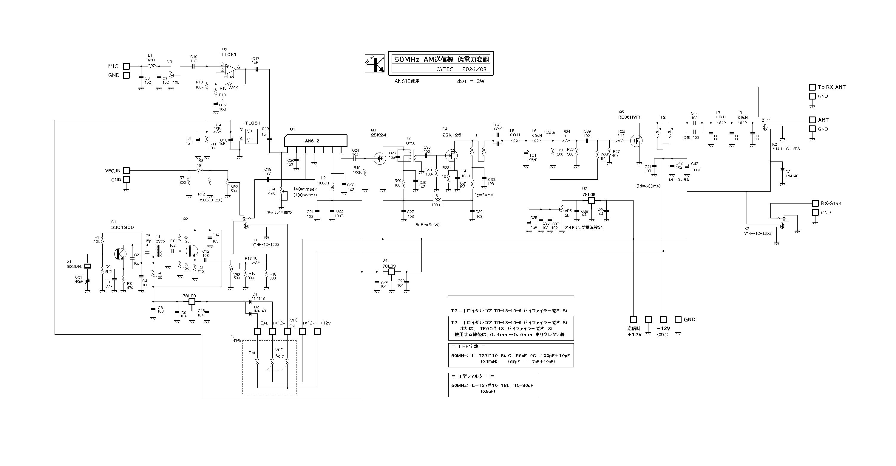 みなさん、こんにちは。50MHzAM送信機の実験がほぼ終わったので、回路図を書いてみました。