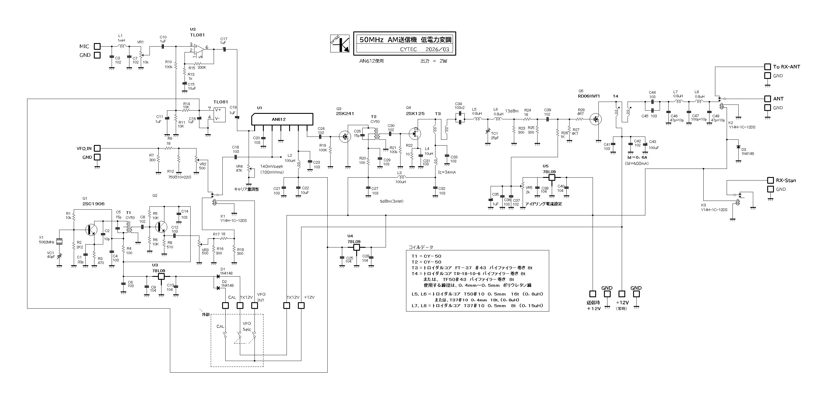 50MHzAM送信機の実験がほぼ終わったので、回路図を書いてみました。