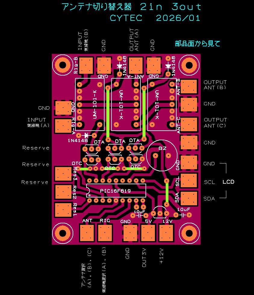 2026/02−05 JE1AHW/内田 ANT + RIG 切り替え器 3ANT↔2RIG 部品配置図 ・・・ (1)