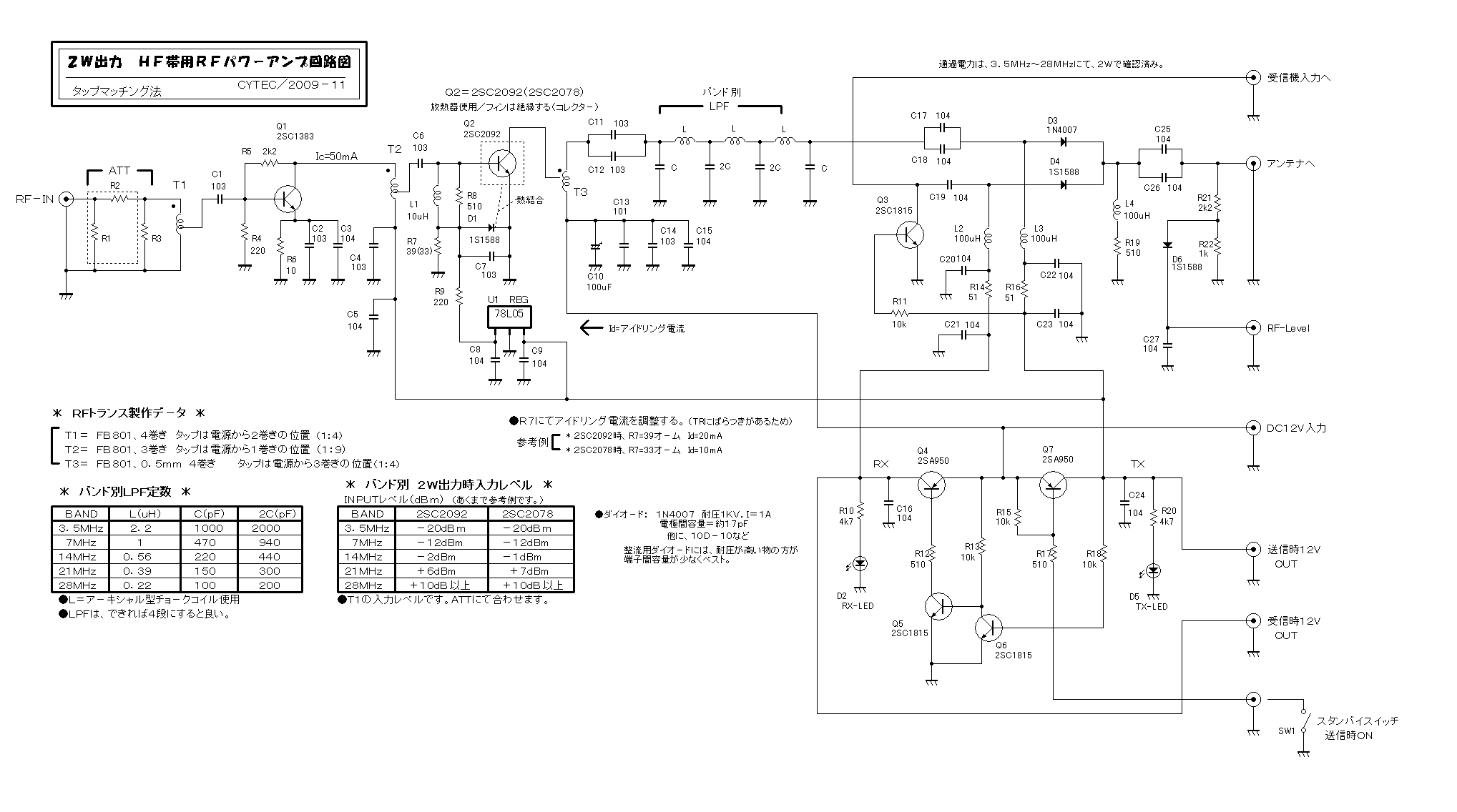2009−12/20 JE1AHW/内田 HF帯用 2W出力 リニアアンプ リレ−レス・タイプの開発(回路図、部品配置) ・・・(1)、(2)