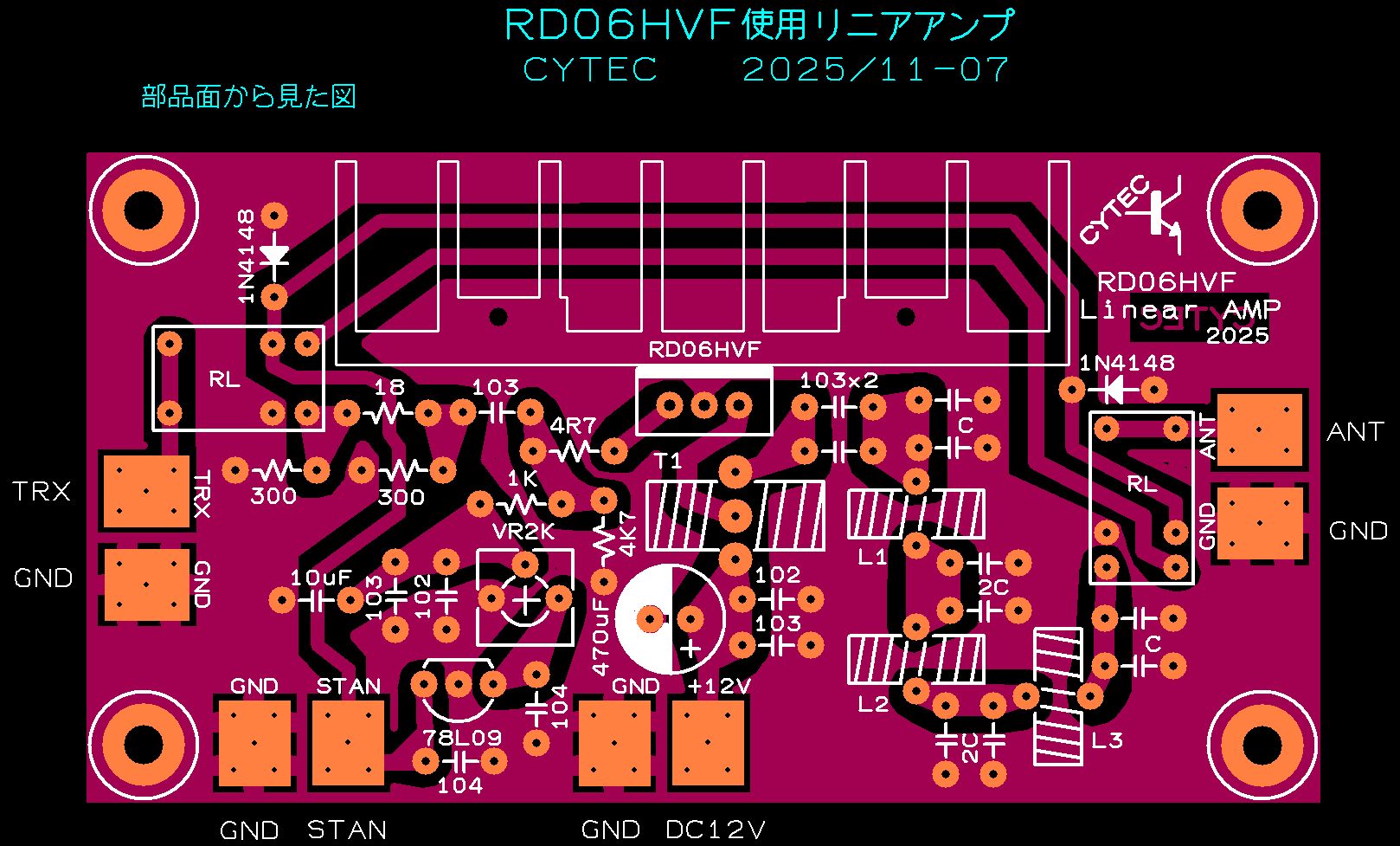 このリニアンプは、LPFの定数を変えれば他のバンドの物が製作できます。その際のドライブ電力は、100mWを守ってください。